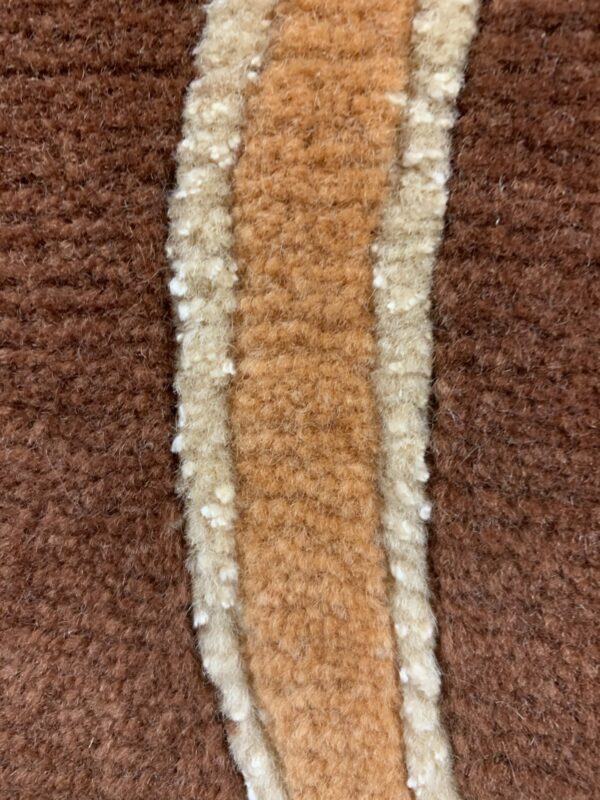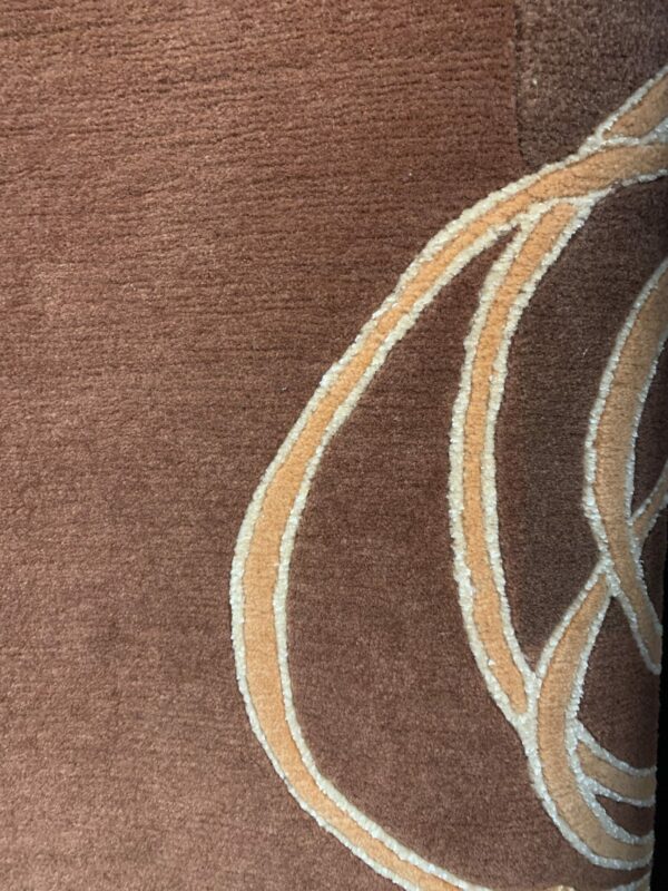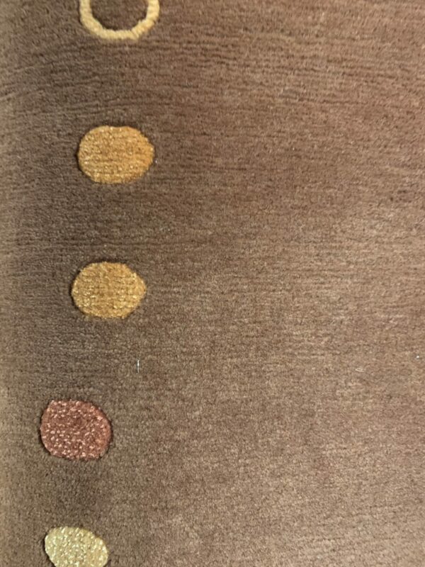 Original Nepal Design-Teppich. Wahrhaftig ein Einzelstück, ein Unikat. Dieses Dekor und diese Farbgebund gibt es wirklich nur einmal auf der Welt. Teppiche aus unserer Ausstellung wurden zur Ansicht und Festlegung einer Jahreskollektion für einen großen deutschen Teppichimporteur geknüpft. Die sind jedoch nicht in eine Massenproduktion reingeflossen, weil der Großhändler kurze Zeit darauf insolvent war. Die Teppiche bestehen aus sehr strapazierfähigen, reiner Hochgebirgswolle (Neuseeland) mit Seide. Wunderschöne, ausgefallene Designs. Der UVP für diesen Teppich liegt bei 1298,00€. Das Maß ist ca. 170×240 cm. Ohne Fransen.