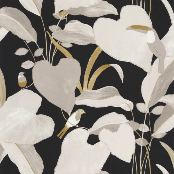 Auf einem schwarzen Untergrund zeigt die Amazonia OYS101421202 Tapete von Caselio große unterschiedliche Blätter in Beige/Creme. Verschiedene Vögel lassen das Bild aufleben. Golden Akzente und Punkte, die in der ganzen Kollektion immer wieder aufgegriffen werden, setzen die Highlights.