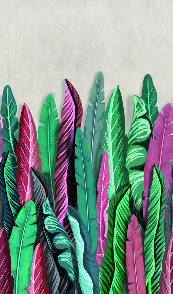Die modern gestaltete Fototapete 47206 zeigt längliche Blätter in einem saftigen Grün kombiniert mit einem kräftigen Rot. Holen Sie sich ein Stück Natur an Ihre Wand!